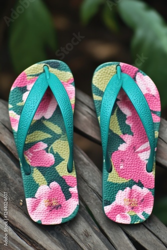 A pair of flip flops resting on a wooden bench