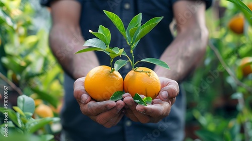 orange, citrous, farmer, hand, green, leaf, fruit farm, ripe, fruit, agriculture, harvest, nature, fresh, healthy, vitamin, juicy, sweet, food, produce, tree, plant, growth, farm, rural, summer, sun, bright, yellow, organic, natural, background, blur, closeup, photo, image, picture, stock