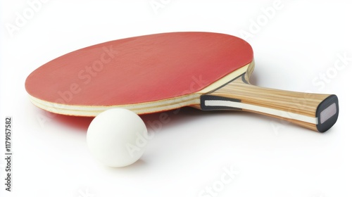 A pair of table tennis paddles and a ball arranged cleanly on a white background