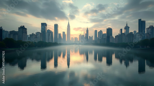A panoramic view of a cityscape with tall skyscrapers reflecting in a still lake at sunrise. The sky is a soft blue with a few clouds.