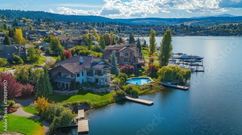 A panoramic view of Lake Coeur d'Alene, Idaho, USA with waterfront homes, docks and marina at Rockford Bay.