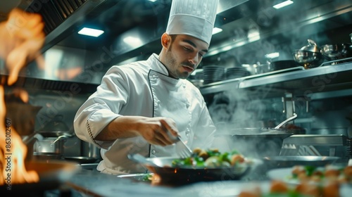 A passionate chef preparing gourmet dishes in a restaurant kitchen