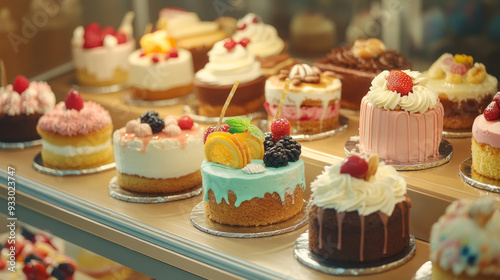 “A pastry shop display window featuring a variety of cakes. The display showcases an assortment of beautifully decorated cakes, each with unique designs and flavors, attracting attention and enticing