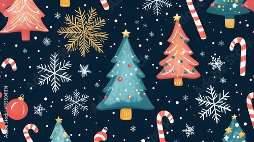 A pattern of cute cartoon Christmas trees snowflakes and candy canes with bright festive colors