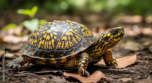 turtle, reptile, shell, animal, nature, wildlife, forest, outdoors, ground, brown, yellow, spotted, scale, texture, wild, creature, terrestrial, shelled, slow, ancient, life, ecology, habitat, organic, natural, background, earthy, detail, skin, eye, head, leg, claw, naturalistic, exploration, journey, movement, walking, scaly, old, peaceful, serene, timberland, leaf, beautiful, colourful, bright, creative