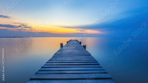 A peaceful wooden pier at dawn, leading toward a calm sea with soft light reflecting off the water.