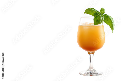 a peach cocktail in a glass with a basil leaf on a white background, png, transparent
