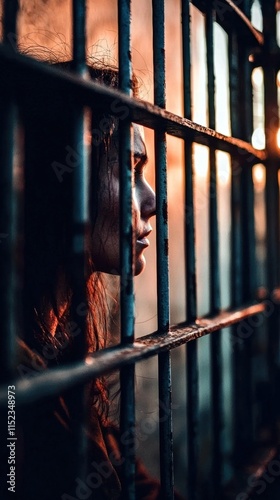 A pensive woman gazes through prison bars, illuminated by sunset hues.