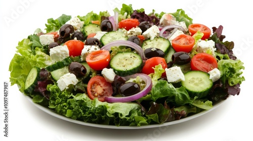 perfectly, assembled, greek, salad, mixed, greener, tomatoes, cucumber, red, onion, olive, feta, cheese, dressing, each, vibrant, colours, subtile, captured, precision, set, isolated, white, background, highlight, mediterranean, favor