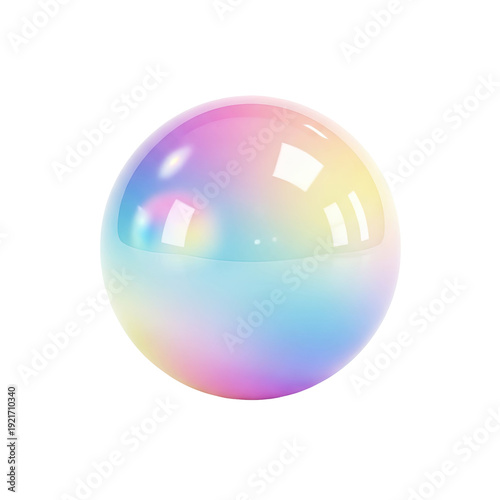 A perfectly spherical, iridescent orb with a smooth, glossy surface, displaying soft pastel rainbow colors that shift and blend beautifully, isolated on a black background.