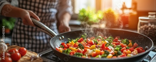 A person cooking colorful vegetables in a frying pan on a stovetop, with steam rising, in a warm kitchen atmosphere, showcasing a healthy and vibrant meal preparation.