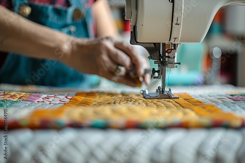 person, create, quilt, sew, machine, use, fabric, thread, needle, craft, project, artisan, creative, workshop, hobby, maker, needlecraft, tailor, automaton, hand-made, portable, dressmaker, handcraft, garment