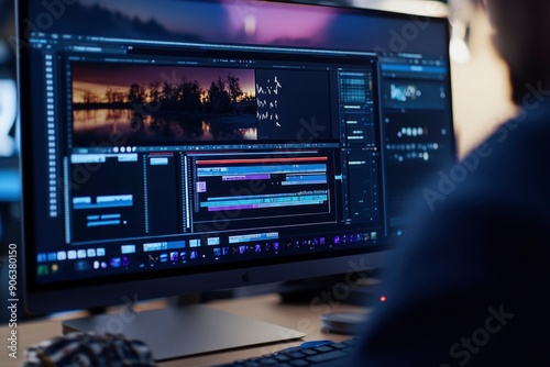computer, screen, editing, video, sunset, landscape, tree, sky, horizon, water, dusk, twilight, dark, colours, light, monitor, keyboard, mouse, desk, person, work, creative, technology, digital, software, project, workflow, sharpened, blurry, background, foreground, detail, composition, contrast, design, filmmaker, editor