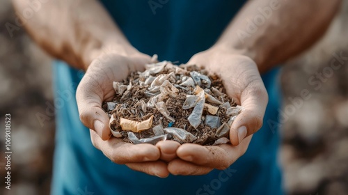 A person holds a handful of soil mixed with small fragments, emphasizing a connection to nature and the importance of organic materials.