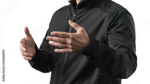 gesture, black, hand, isolated, sleeve, jacket, creative, person, abstract, motion, fashion, model, background, communication, man, expressive, human, casual attire, clothing, standing, neutral, style, photogenic, white, body, pose, profile, individual, speech, expression, urban, wearing, apparel, design, active, professional, isolation, movement, art