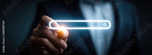 A person in a suit holds a glowing search bar, emphasizing a digital search concept against a dark backdrop with blurred details