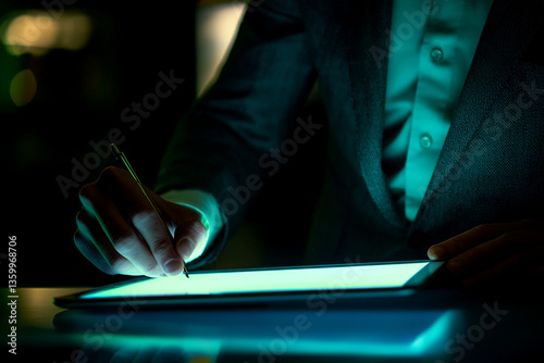 A person in a suit using a stylus on a glowing tablet in a dimly lit environment with dark background
