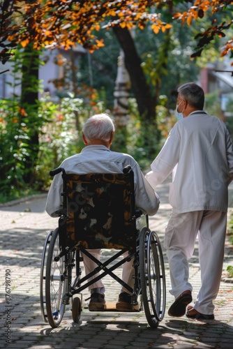 A person in a wheelchair accompanied by a man in a white suit, possibly for an interview or meeting