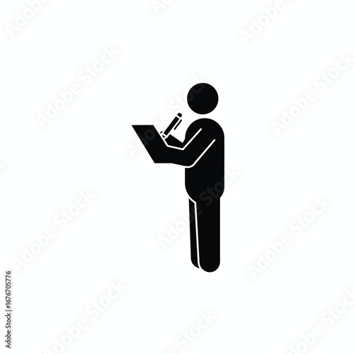 person, writing, note, silhouette, standing, pen, paper, human, male, figure, drawing, icon, symbol, signs, clip art, illustration, design, black, white, simple, minimalist, outline, shape, stick, man, document, record, mark, write, hold, hand, business, office, work, job, task, activity, planning, idea, concept, information, message, communication, report, list, form, page, sheet