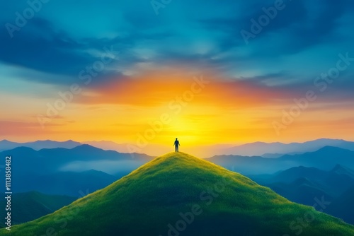 A person standing triumphantly on top of a mountain at sunrise, symbolizing achievement and success. Generative AI