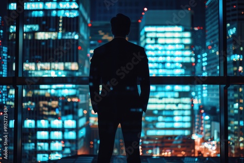 A person stands in front of a window, gazing out at the city lights at nighttime