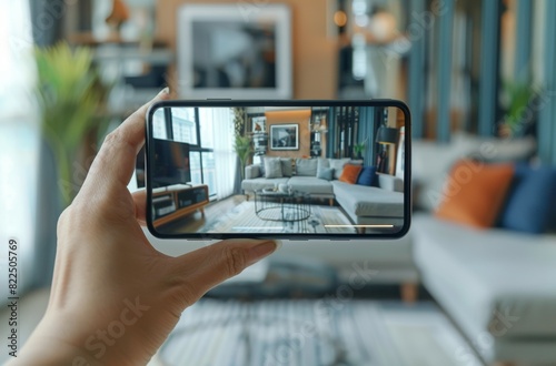 A person takes a photo of a stylish modern living room using a smartphone, showcasing interior design and technology.