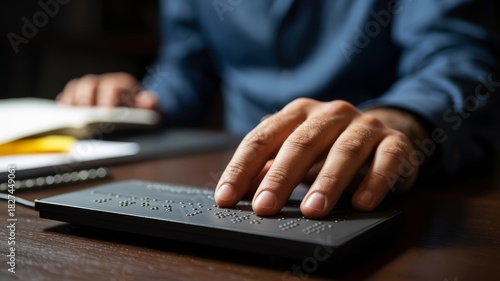 A person using a Braille display on a wooden desk, with a notebook and pen nearby, highlighting assistive technology for the visually impaired.