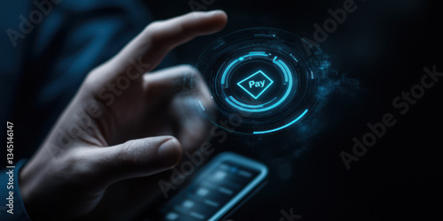 A person using a smartphone, with a futuristic holographic payment interface floating above the screen.
