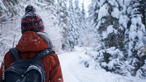 A person walking through a snowcovered forest bundled up in warm winter gear on their way to a remote sauna..