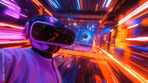 A person wearing a VR headset experiences a futuristic digital world with bright neon lights and fast motion.