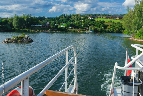 A perspective from a boat deck with white railings and Polish flag gliding across czorsztyn lake. The shore reveals cottages, trees, and summer landscapes, evoking leisure, relaxation, and outdoor adv