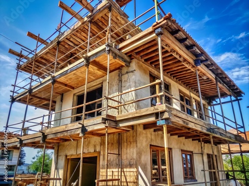 construction, building, architecture, incomplete, wooden, scaffold, precarious, balcony, upper, floor, project, site, renovation, repair, overhaul, redevelopment, reconstruction, revitalization, renewal, makeover, transformation, improvement, progress, engineering, plan, urban, infrastructure, edifice, facades, exterior, city landscape, scenic, view, perspective