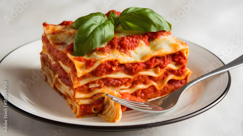 white background, top, soft, plate, photo, pasta, middle, lighting, layered, lasagna, fork, cheese