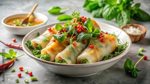 A photo of a steaming Vietnamese Bun Cha Gio bowl, topped with crispy spring rolls and fresh herbs like cilantro and basil, garnished with chili flake