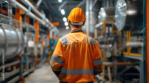 A photo of an industrial worker in a hard hat and uniform working on a gas plant. visible from behind with focus on the detailed machinery