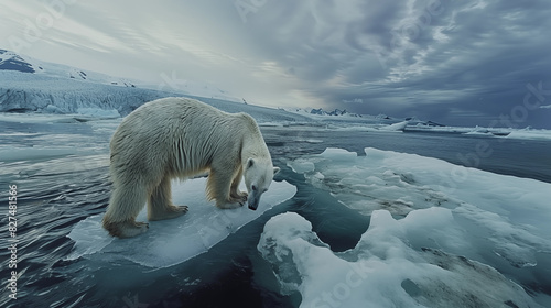 A photograph of a polar bear standing on a melting ice floe, surrounded by open water and distant glaciers.