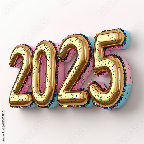 A photostock of colorful "2025" text with confetti raining down, set on a clean pastel pink background, perfect for celebration themes. High Quality