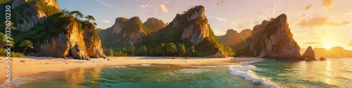 picturesque, island, pristine, beach, towering, cliff, bathe, gold, light, sunrise