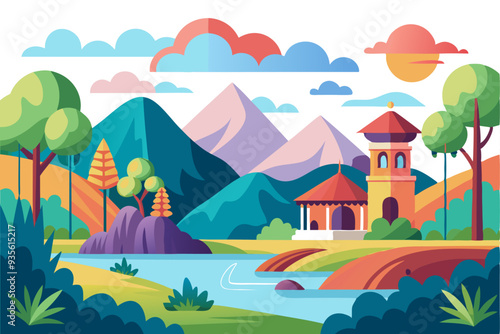 landscape, river, mountain, building, tree, sky, cloud, blue, white, green, brown, orange, yellow, red, purple, pink, nature, scenic, vista, serene, tranquil, peaceful, idylli, picturesque, beautiful, breathtaking, majestic, stunning, vibrant, colourful, artistic, illustration, graphic, design, digital, artwork, flat, cartoon