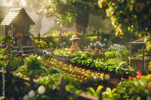 A picturesque school garden with children planting flowers and vegetables