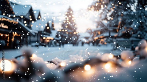A picturesque village blanketed with snow, illuminated by festive lights. The cozy, peaceful atmosphere captures the essence of winter and holiday cheer.