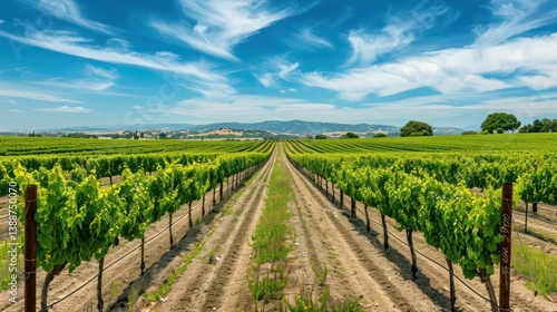 A picturesque vineyard with rows of grapevines stretching into the distance, under a bright blue sky.