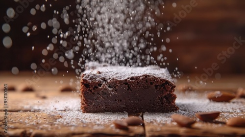 a piece of chocolate cake is sprinkled with sugar