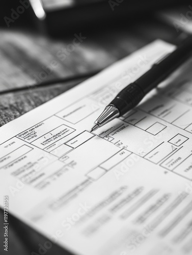 A piece of paper with various checkboxes and text fields, likely to be filled out by hand, with a pen placed next to it.