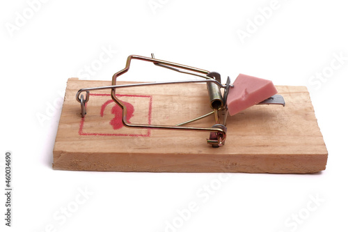 white, isolated, closeup, symbol, metal, danger, animal, floor, mouse, hazard, warning, eat, tasty, equipment, cheese, wood, threat, yellow, snack, wooden, bait, shot, death, forbidden, capture, risk, tool, signs, colours, produce, piece, trick, trigger, deception, catch, rat, dangerous, trap, background, food, rodent, eliminate, eradication, exterminate, destroy, mousetrap, metallic, with