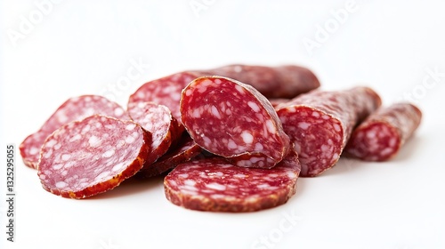white background, isolated, food, salami, sausage, sliced, meat, savoury, delicious, protein, snack, meal, italian cuisine, treat, spicey, charcuterie