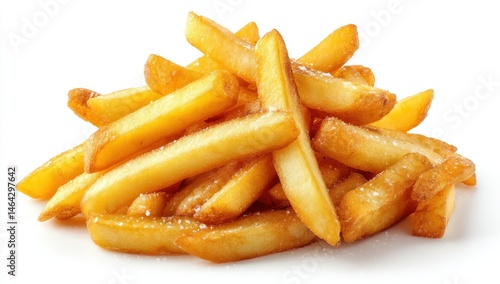 A pile of golden, crispy French fries sprinkled with salt on a white background.