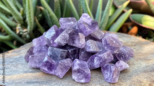 A pile of purple amethyst crystals glowing under soft lighting, showcasing their natural beauty.