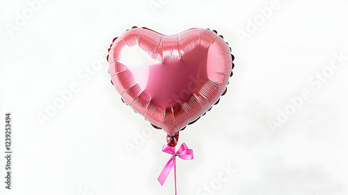 A pink heart-shaped balloon tied with a ribbon floating in the air against pure white background.