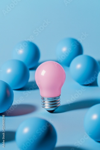 A pink light bulb stands out from the crowd of blue ones, against a pastel-colored background.